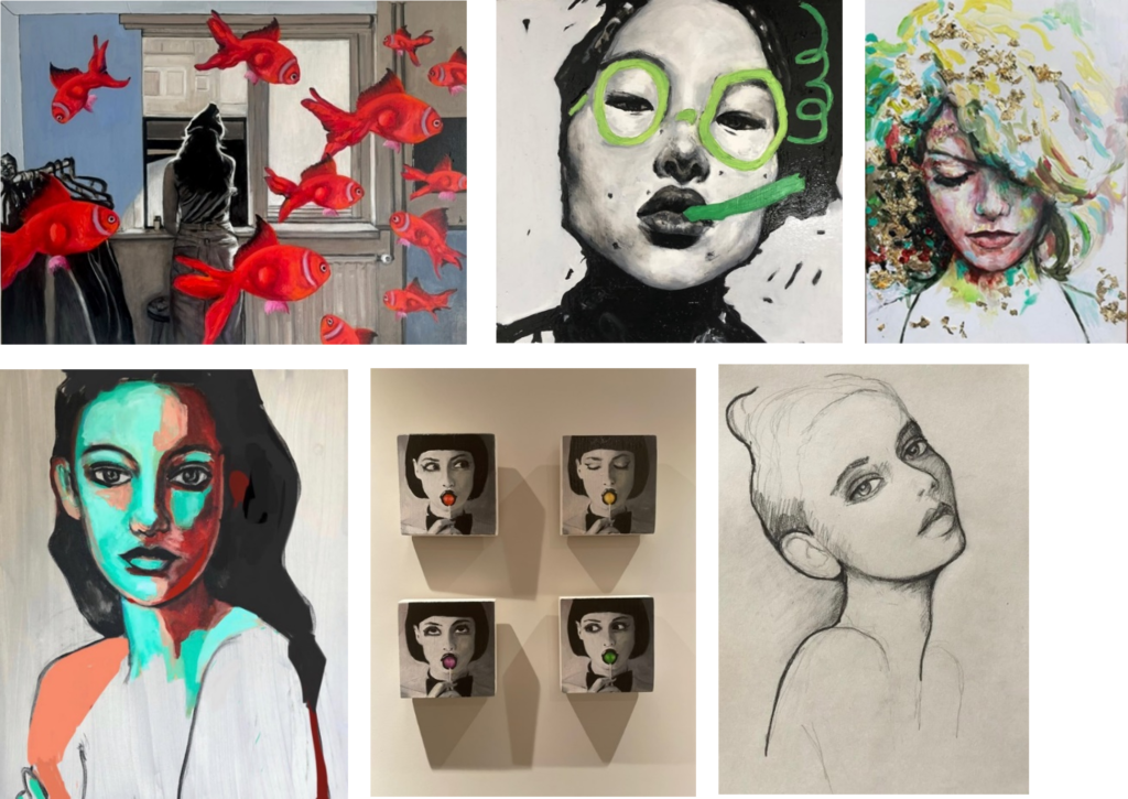 Basistechnieken – aquarel krijg je niet in 1 les onder de knie. Moniek heeft verschillende oefeningen om het te leren, incl advies over materiaal en papier. Na een paar lessen komt de vaardigheid en in de 10e les kun je mooie werken maken. Bij Portret volgt allereerst een basis uitleg/oefening over de verhoudingen van een gezicht. Daarna een opzet met aquarelpotloden en verder uitwerken in een kleur. Een portret adhv een foto, in realistische kleuren maar kan natuurlijk ook anders! Bv Pop-art. Landschap of andere onderwerpen – Moniek heeft een map boordevol met voorbeelden om allerlei onderwerpen te leren aquarelleren. Hieronder werken van deelnemers van Blok 3 2022.