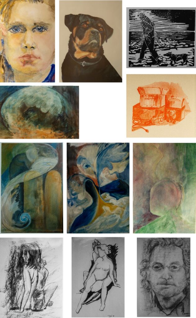 Meestal bespreek ik eens in de twee lessen een kunstenaar met foto’s van zijn of haar werk, ter inspiratie. En ik kan iedereen begeleiden met verschillende technieken en materialen.