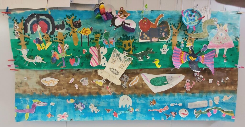 Als voorbereiding op het schilderen en de werking van de kleuren en vormen onderling gaan we aan de gang met collages van gescheurd gekleurd papier uit oude tijdschriften.