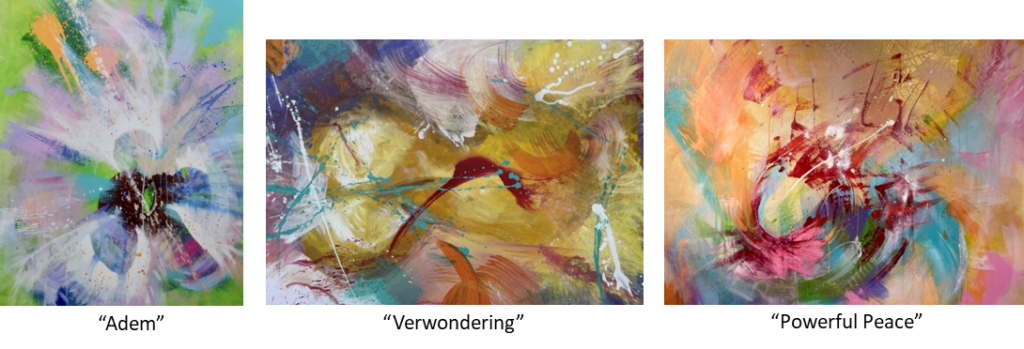 Ik houd van kleur, abstractie en beweging. Puur uit de pot, intens als het leven zelf. Er moet ruimte zijn voor de kijker. Voor haar of zijn eigen verhaal. Of het nu herkenning oproept of niet.