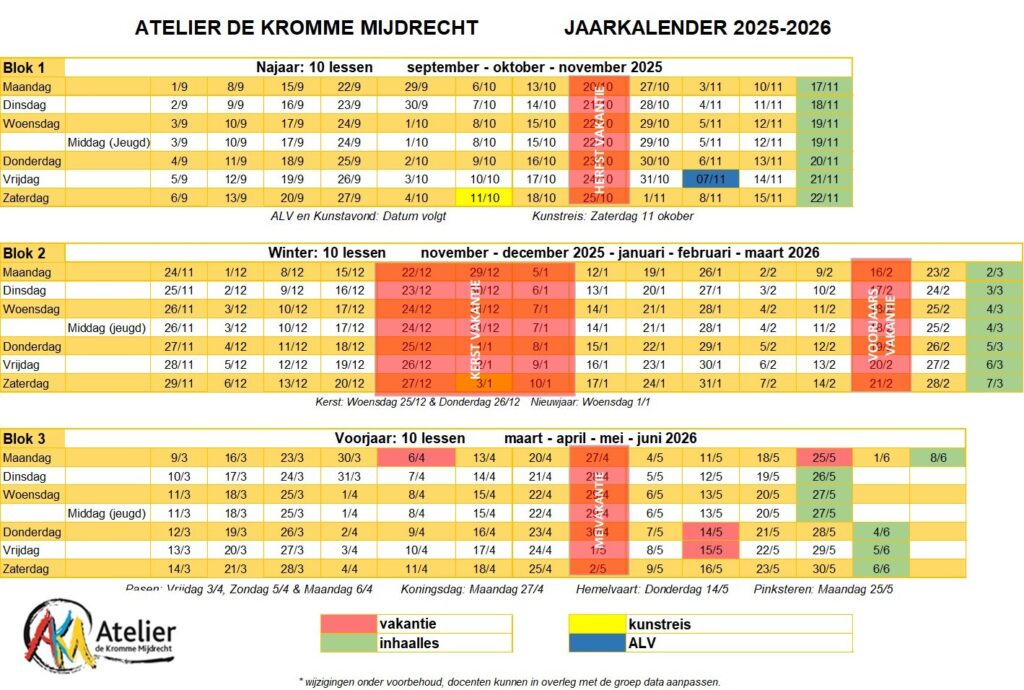 Elk jaar biedt Atelier de Kromme Mijdrecht een gevarieerd cursusaanbod voor volwassenen en jeugd verdeeld in 3 blokken van 10 lessen. Je kunt 1 of 2 blokken meedoen, of alle 3 voor een lager tarief (zie pagina tarieven). Instromen bij een lopend blok is ook mogelijk. De docent biedt thema’s, voorbeelden, inspiratie en vakkennis. Aan een eigen onderwerp werken is zeker mogelijk, de docent gaat je helpen waar mogelijk. Op de docentenpagina vind je meer info over de docenten en hun expertise. Hieronder het lesrooster 2025-2026, bijgewerkt op 24-06-2025.