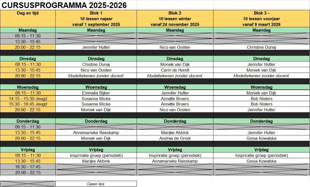 Elk jaar biedt Atelier de Kromme Mijdrecht een gevarieerd cursusaanbod voor volwassenen en jeugd verdeeld in 3 blokken van 10 lessen. Je kunt 1 of 2 blokken meedoen, of alle 3 voor een lager tarief (zie pagina tarieven). Instromen bij een lopend blok is ook mogelijk. De docent biedt thema’s, voorbeelden, inspiratie en vakkennis. Aan een eigen onderwerp werken is zeker mogelijk, de docent gaat je helpen waar mogelijk. Op de docentenpagina vind je meer info over de docenten en hun expertise. Hieronder het lesrooster 2025-2026, bijgewerkt op 01-03-2026.